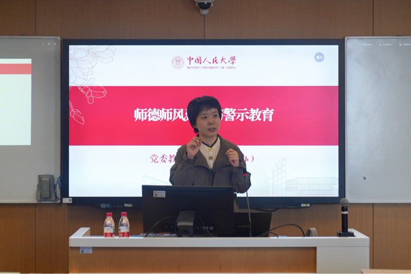 田晓晖系统阐述了师德师风建设的四大核心内容,首先深入阐释了相关的政策背景与实践要求,为教职工准确把握和落实师德规范提供了清晰指引。随后,她生动讲述了吴玉章、成仿吾等先进典型潜心育人、廉洁从教的感人事迹,引导教师以榜样为镜,涵养高尚师德。接着,她从工作实际出发,以高校发生的警示案例全方位剖析了师德违规问题:在教学上严禁敷衍塞责与擅自兼职;在科研中杜绝抄袭剽窃和滥用经费;于社会活动中不得损害国家利益与违背公序良俗,希望全体教师既要“看齐高线”成为优良传统的传承者,也要“坚守主线”做经师与人师统一的践行者,更要“远离红线”担当清风正气的守护者。