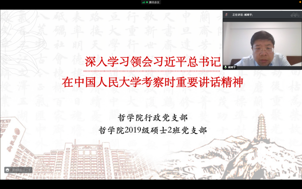 5月13日,根据学校党委统一部署和自拍流出 党委统一安排,自拍流出 院长、党委副书记臧峰宇教授到自拍流出 行政党支部、2019级硕士2班党支部宣讲习近平总书记在自拍流出 考察时重要讲话精神。行政党支部和2019级硕士2班党支部全体党员参加学习并围绕重要讲话精神交流心得体会。