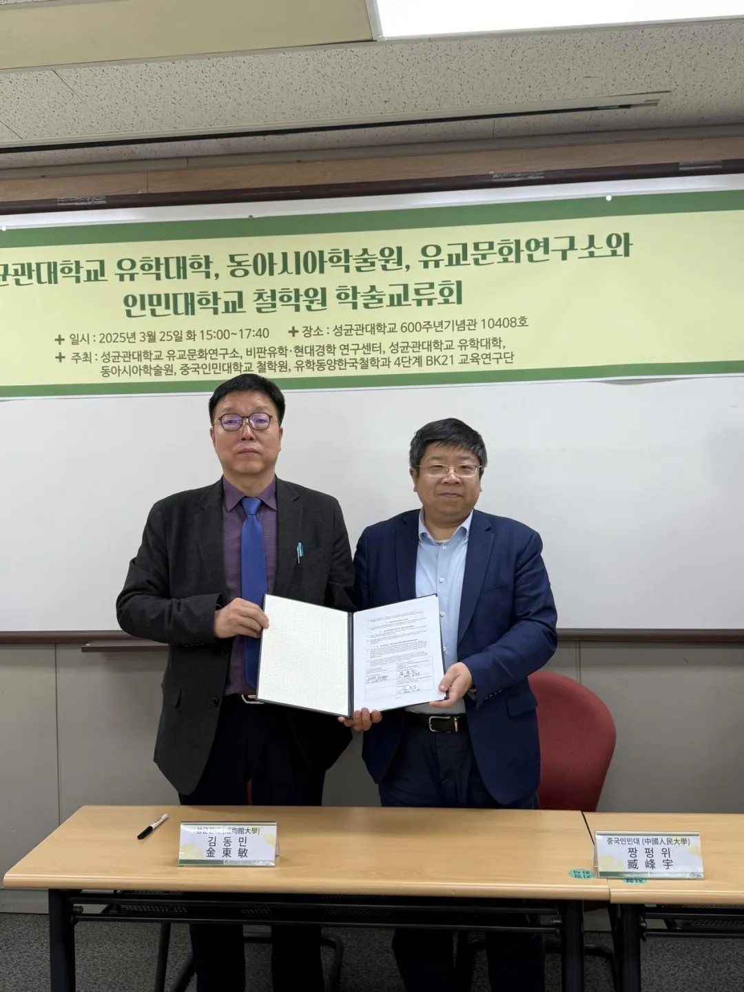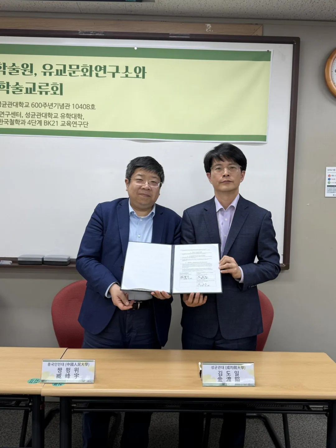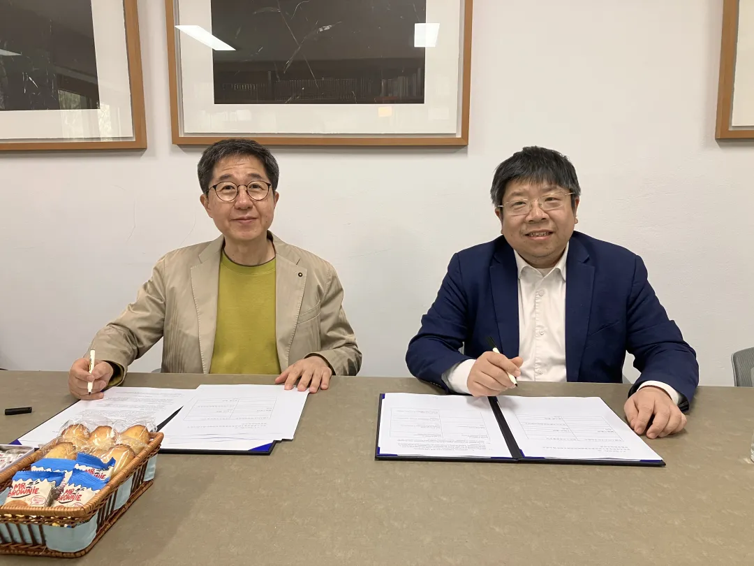 臧峰宇院长分别与首尔大学哲学系主任丁垣在教授、哲学思想研究所所长张元泰教授签订合作备忘录。