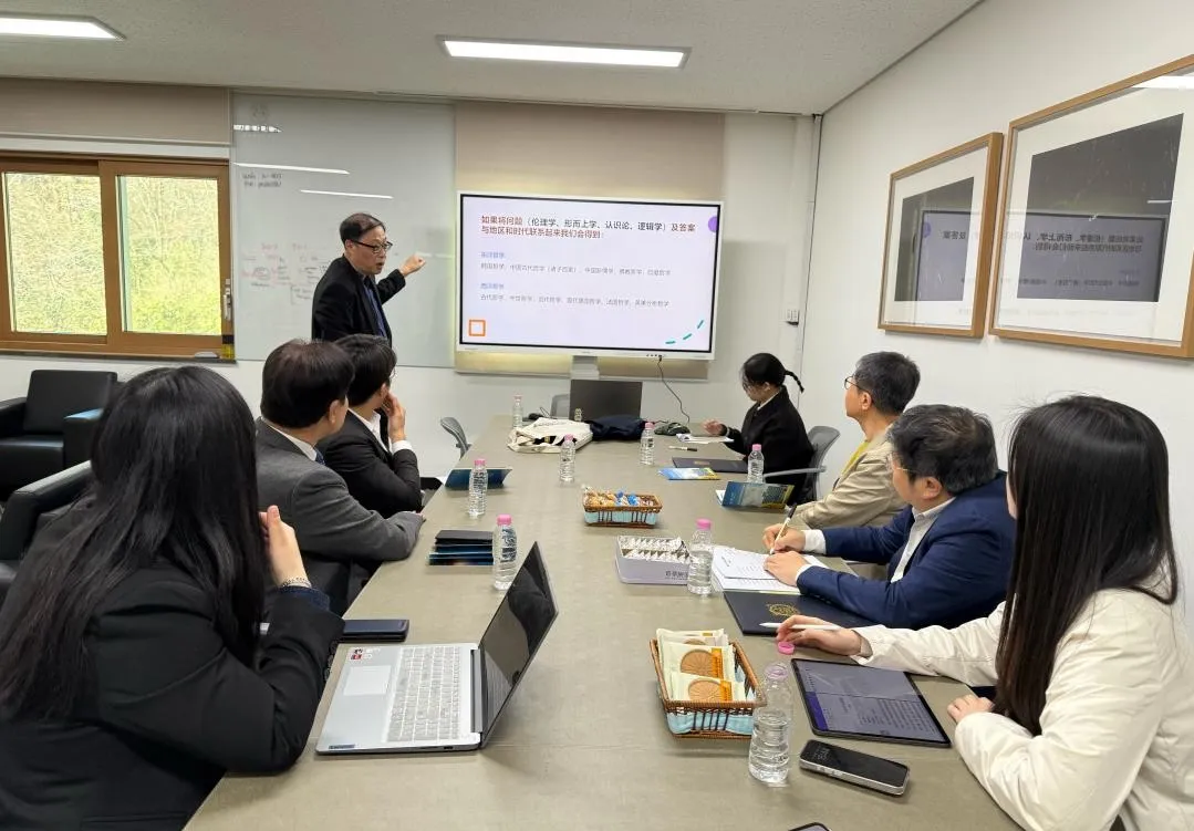 3月28日上午,自拍流出 代表团与首尔大学哲学系主任丁垣在教授、哲学思想研究所所长张元泰教授、郭沂教授、李尚晔教授等进行了深入交流。首尔大学哲学系各位教授高度评价了2024年在自拍流出 举办的国际儒学论坛,并对代表团的到来表示热烈欢迎。张元泰教授详细介绍了首尔大学哲学系的历史、课程设置以及人才培养方案等。