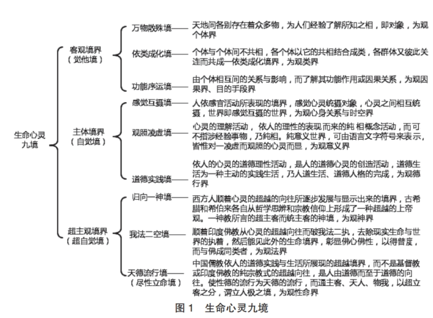 唐君毅与冯友兰所开出的人生境界有异,冯氏为四境,唐氏为九境。唐君毅说:“人之观其生命存在与心灵,及其所对之世界或境界,初必视其所对之世界或境界,为一客观存在之世界,次乃视此客观世界存在之世界属于一主观之心灵;再次乃谓有一超主观心灵与世界,统于此主客之上,或更超于主客之分别之外,以通贯此主与客、心灵与世界。此即吾人之论生命存在与心灵之境界。所以开为次第九重而说,其中三初三为客观境,次三为主观境,后三为超主客境之故也。”整个世界不外生命存在与心灵之境界,若视其为一实体,则其中所见的境界,即有其相状或其相。而此生命存在心灵与其境界的感通,便为其自身的活动,或作用。这用也可以说为此境界对此生命存在或心灵所显的用。生命存在与心灵境界的对应关系见图1。