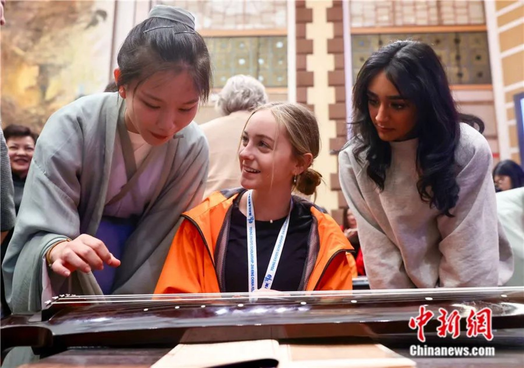 2024年3月20日上午,中美学子在北京大学开展交流,来自美国华盛顿州的两名中学生体验古琴。易海菲 摄
