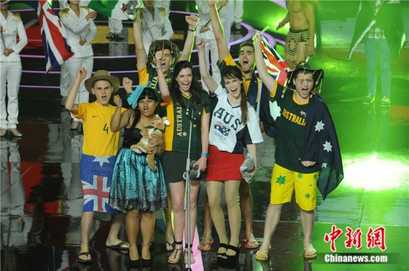 2013年7月6日晚,第十二届“汉语桥”世界大学生中文比赛在湖南长沙揭幕,来自澳大利亚的参赛选手在舞台上振臂高呼为自己加油。杨华峰 摄