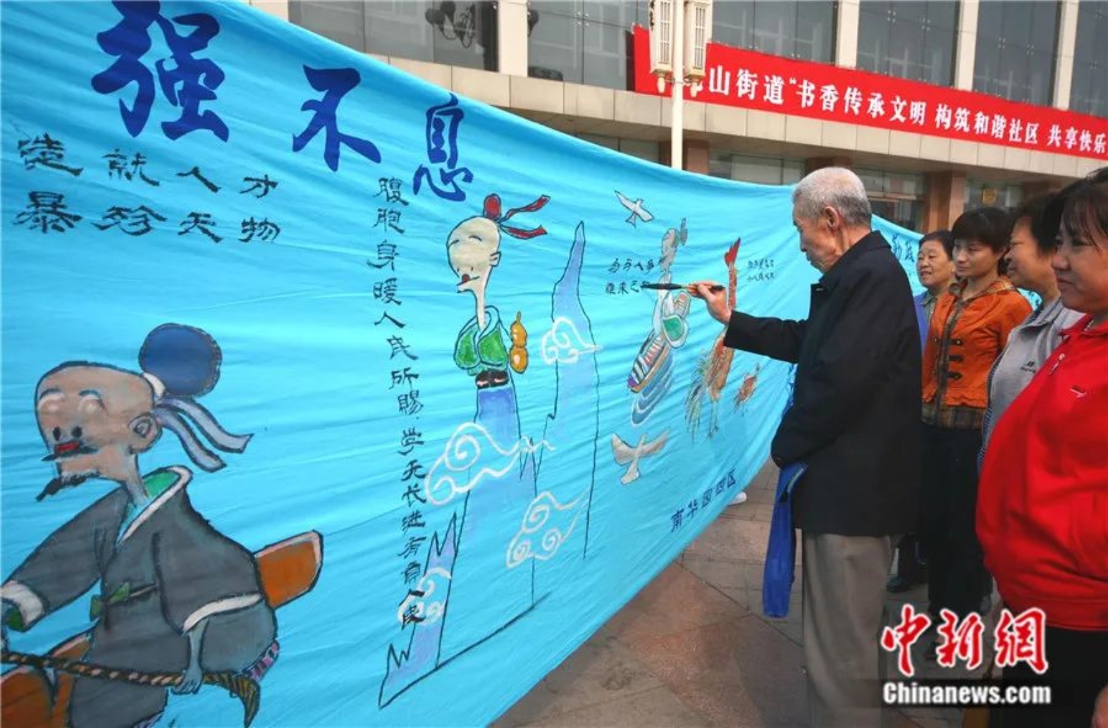2008年4月18日,北京市怀柔区的百名社区居民现场绘制“中华传统美德”长卷。卜向东 摄