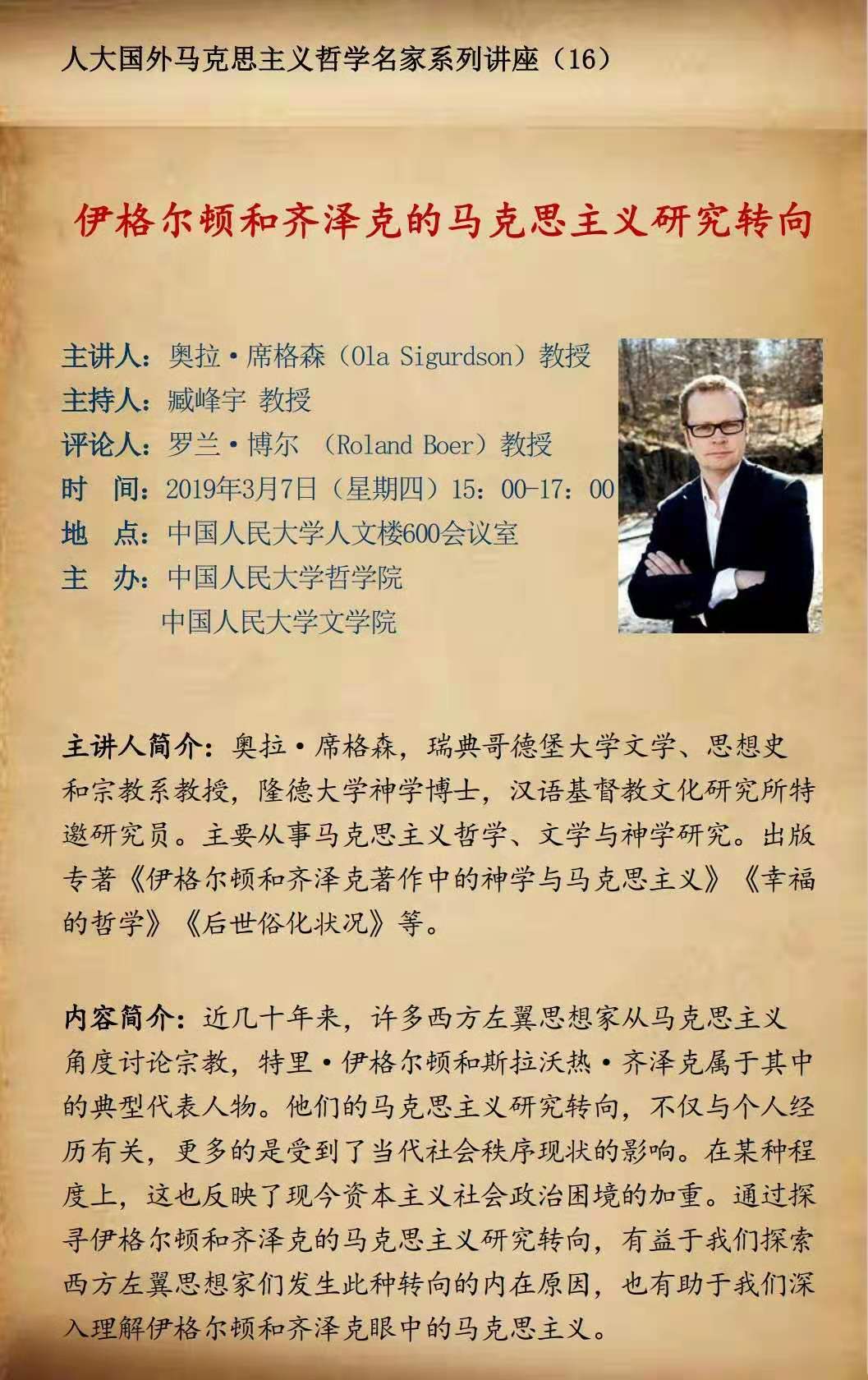 主讲人简介:奥拉·席格森,瑞典哥德堡大学文学、思想史和宗教系教授,隆德大学神学博士,汉语基督教文化研究所特邀研究员。主要从事马克思主义哲学、文学与神学研究。出版专著《伊格尔顿和齐泽克著作中的神学与马克思主义》《幸福的哲学》《后世俗化状况》等。