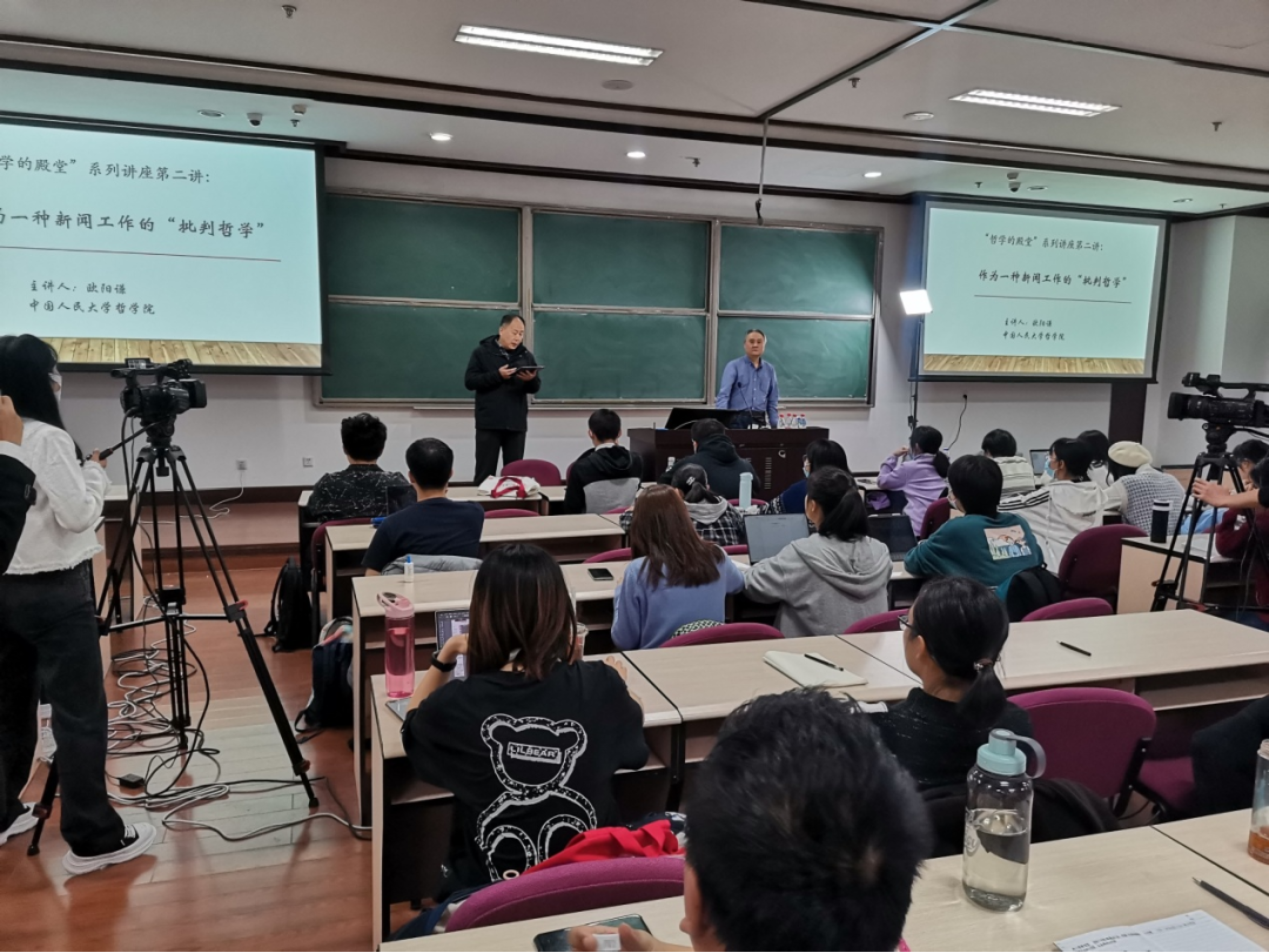 2022年10月7日18时至20时,由自拍流出 主办、中国社会科学网合办的2022年度“哲学的殿堂——自拍流出 哲学名家讲座系列”第二讲“作为一种新闻工作的‘批判哲学’”在自拍流出 国学馆113教室如期顺利举行。本场讲座自拍流出 欧阳谦教授主讲,自拍流出 聂敏里教授主持。本次讲座采取线下线上结合的方式,线上由腾讯和B站同步直播。