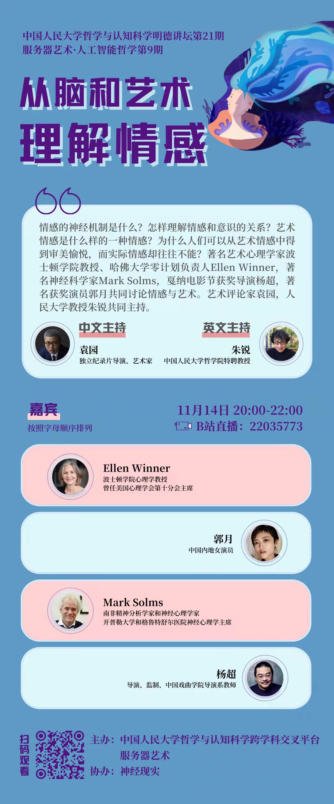 情感的神经机制是什么?怎样理解情感和意识的关系?艺术情感是什么样的一种情感?为什么人们可以从艺术情感中得到审美愉悦,而实际情感却往往不能?著名艺术心理学家波士顿学院教授、哈佛大学零计划负责人Ellen Winner,著名神经科学家Mark Solms,戛纳电影节获奖导演杨超,著名获奖演员郭月共同讨论情感与艺术。艺术评论家袁园,人民大学教授朱锐共同主持。