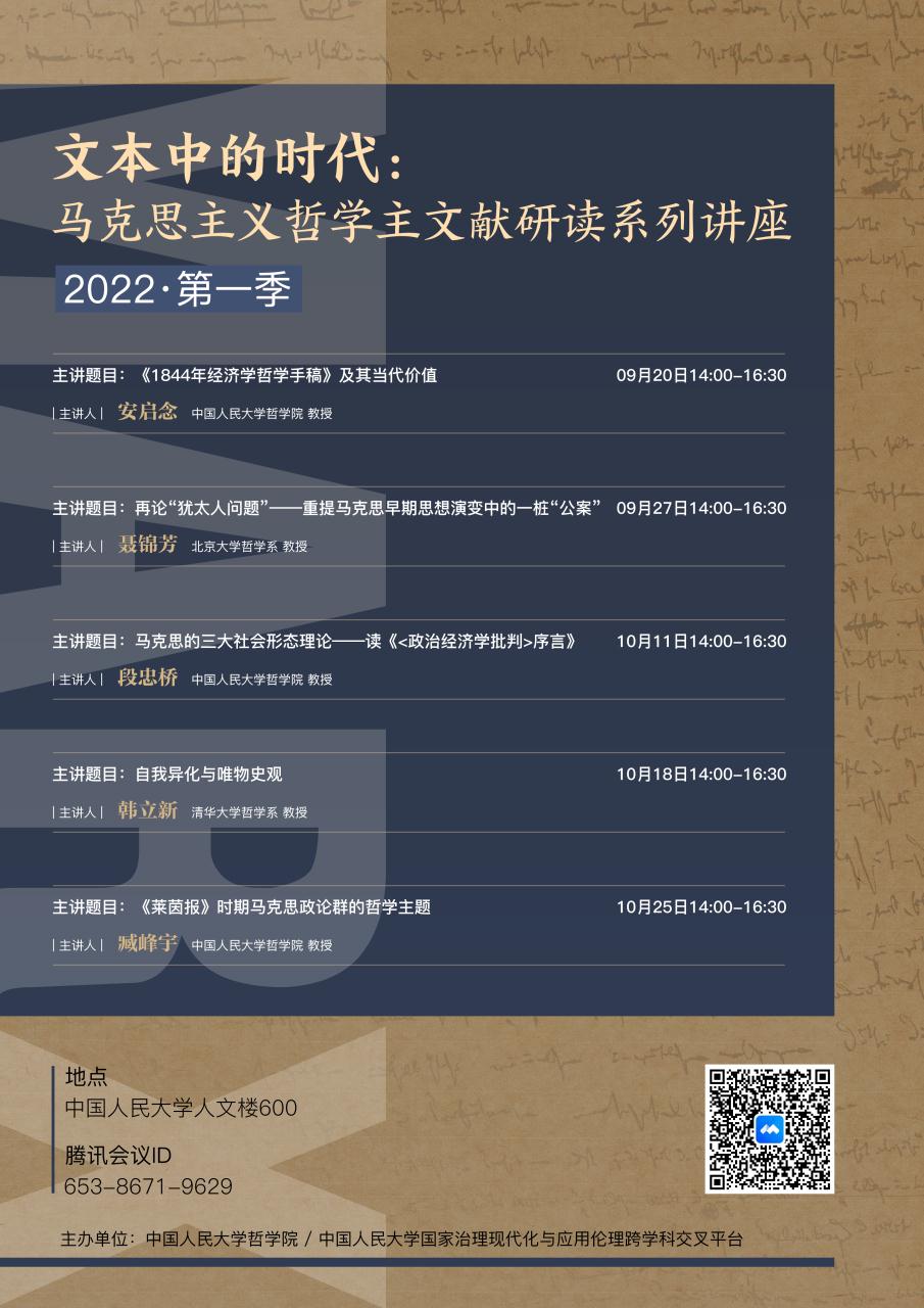 自9月20日起,自拍流出 、自拍流出 国家治理现代化与应用伦理跨学科交叉平台隆重推出“文本中的时代:马克思主义哲学主文献研读系列讲座”。第一季将举办5期,精彩纷呈,敬请期待!