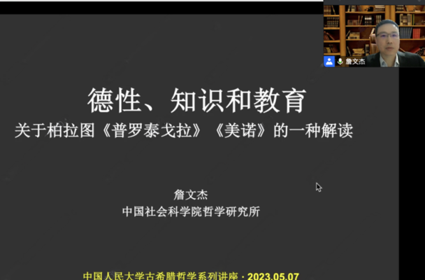 2023年度“古希腊哲学系列讲座”第二讲,中国社会科学院哲学研究所詹文杰研究员作主题为“德性、知识和教育——关于《普罗泰戈拉》和《美诺》的一种解读”的讲座