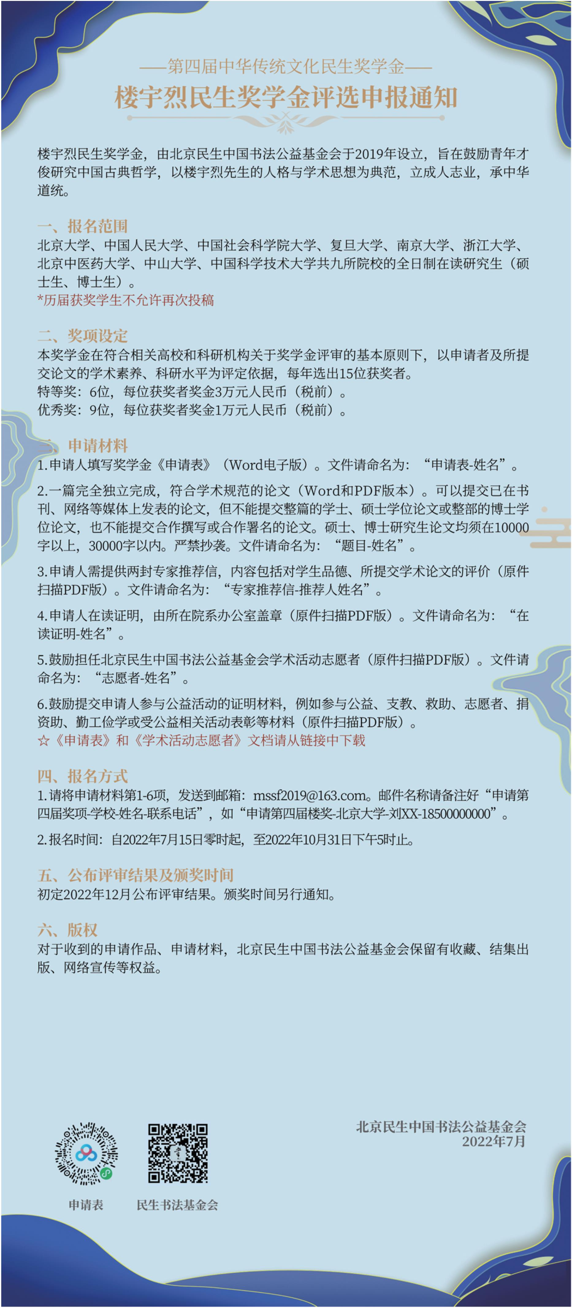 第四届“中华传统文化民生奖学金”楼宇烈民生奖学金评选申报通知