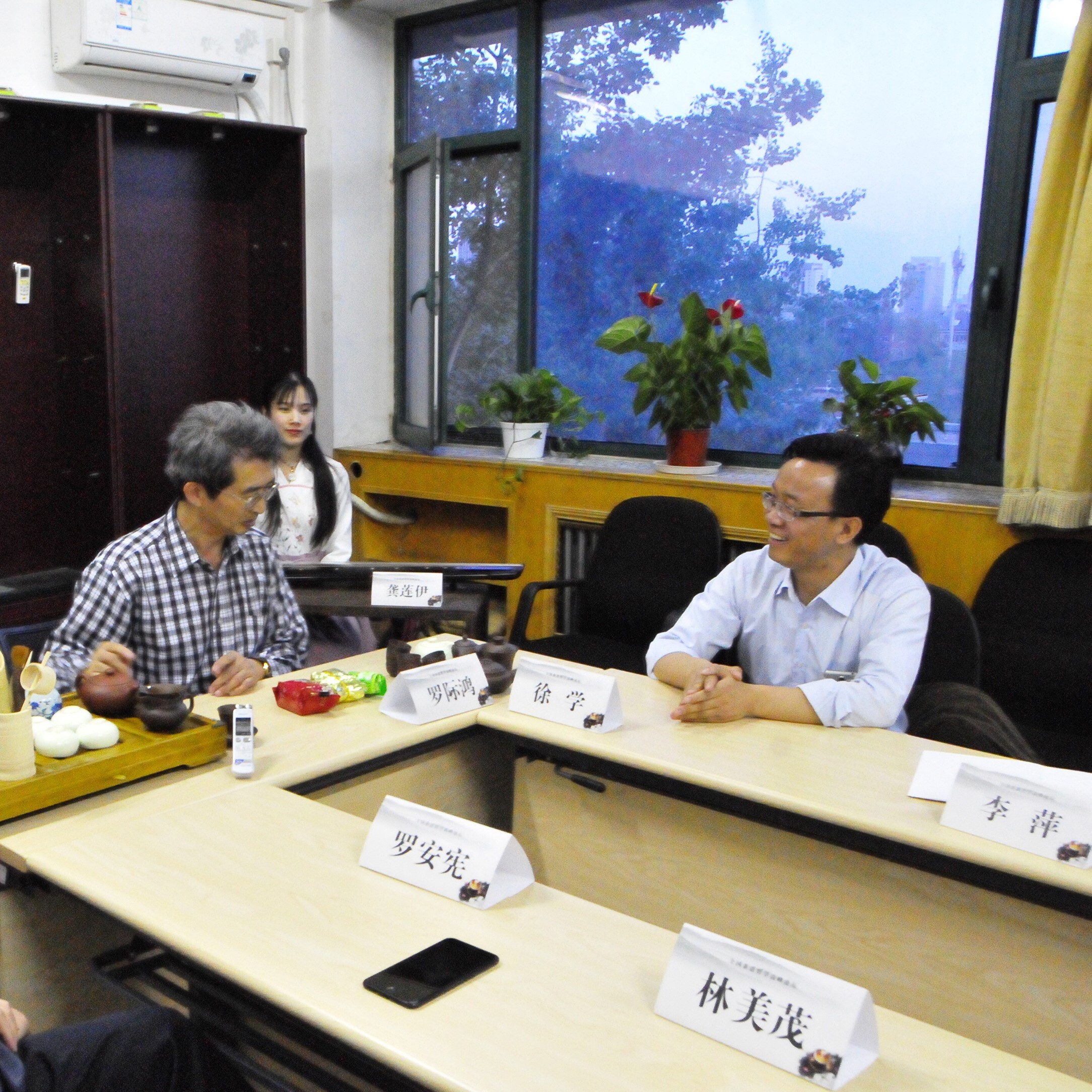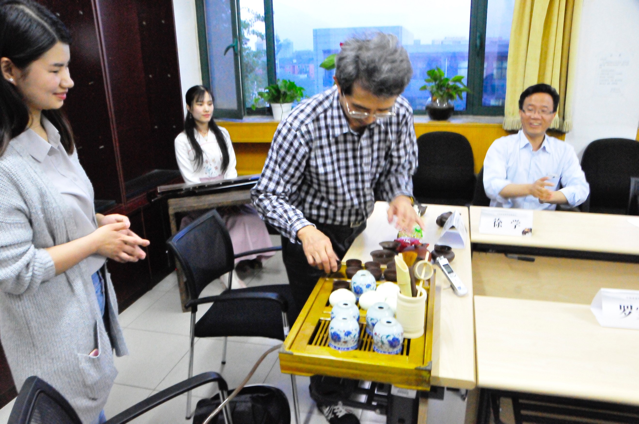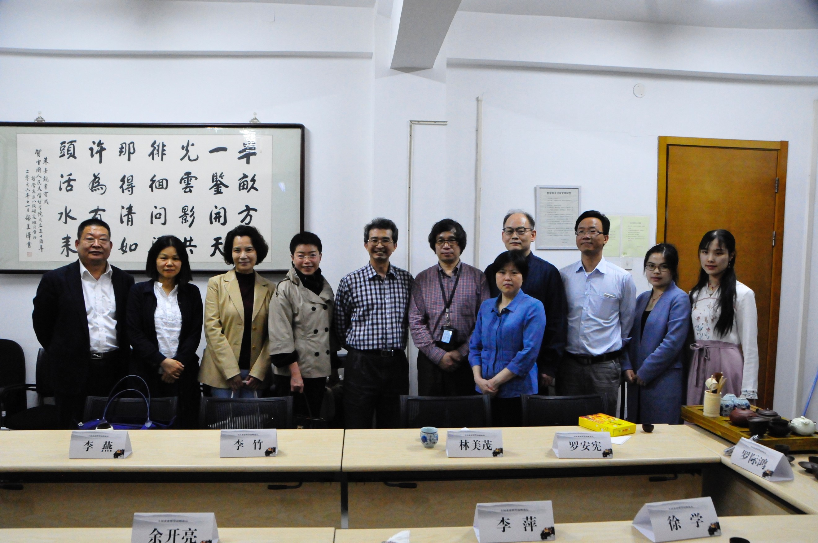 日期:2017-04-304月18日晚,由自拍流出 茶道哲学研究所举办的春日茶会在人文楼621会议室如期召开。参加本次茶会的有来自台茶世家的台湾著名书法教育家罗际鸿先生、自拍流出 茶道哲学研究所所长李萍教授、自拍流出 副院长罗安宪教授、中哲教研室主任林美茂教授、伦理学教研室主任张霄老师和美学教研室余开亮老师。列席本次茶会的还有来自大益茶道院的徐学副院长、中国中铁集团宣传部戴荣里副部长、中华女子学院魏开琼教授、北京拓尔智国际文化交流公司李竹总经理和李燕女士。茶会还邀请了人大国学院的龚莲伊同学为大家表演古琴曲。本次茶会由自拍流出 茶道哲学研究所李萍所长主持。