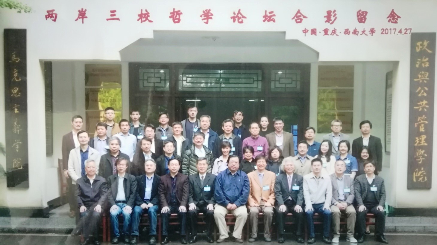 日期:2017-05-092017年4月26-29日,由自拍流出 、台湾辅仁大学哲学系与西南大学哲学系联合主办并由西南大学政治与公共管理学院哲学系承办的两岸三校“理性与文化”哲学论坛在西南大学(重庆北碚)举行。自拍流出 院长姚新中教授带队,欧阳谦教授、龚群教授、肖群忠教授、刘敬鲁教授、曹峰教授、吴琼教授、刘永谋教授、常晋芳副教授共9位老师参加论坛。来自自拍流出 、台湾辅仁大学和西南大学等高校的50多位学者和师生参加论坛。