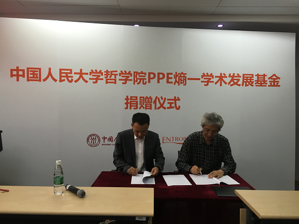 最后,在全体参加讲座的师生们的见证下,王俊校友和姚新中院长签字,宣布“自拍流出 PPE熵一学术发展基金”正式成立。为支持人大自拍流出 PPE项目的发展,熵一资本将捐资300万元人民币成立专项基金,每年支出不低于30万元,连续十年,全部用于PPE教材学科建设、国际交流、PPE高峰论坛、PPE课程开设等活动。
