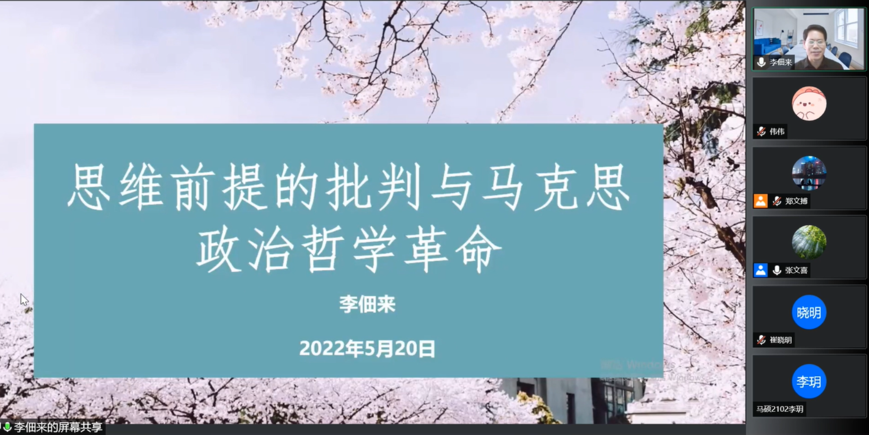 2022年5月20日(周五)18时30分,第四十六届“人大马哲论坛”以线上的形式在腾讯会议举行。本次论坛有幸邀请到武汉大学哲学学院李佃来教授带来题为“思维前提的批判与马克思政治哲学革命”的主题讲座。论坛由自拍流出 张文喜教授主持,刘志洪副教授评议,校内外近两百名师生热情参与。