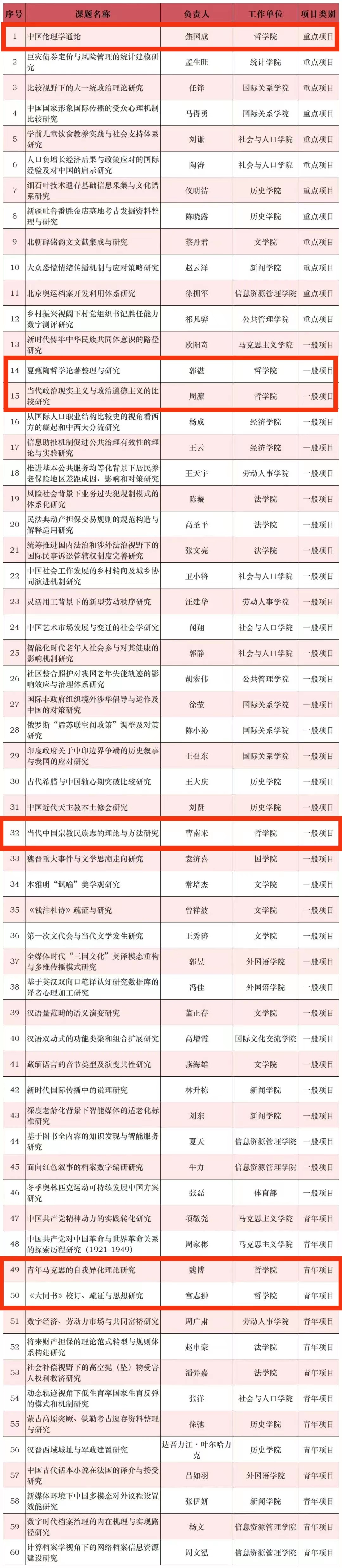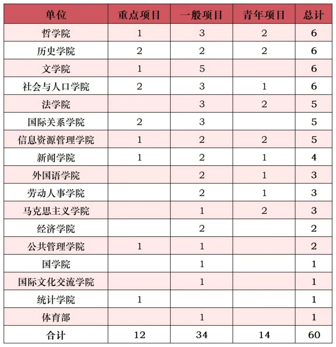 获得立项60项,创历史新高。其中重点项目12项,一般项目34项,青年项目14项,立项总数和重点项目立项数均位居全国高校第一。