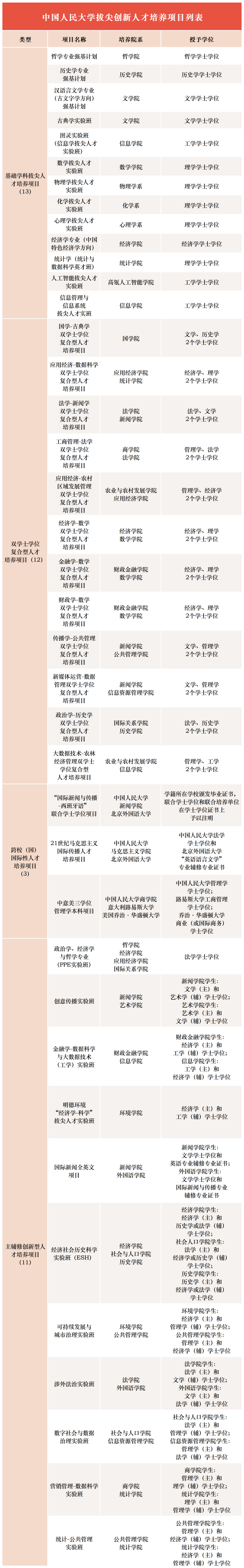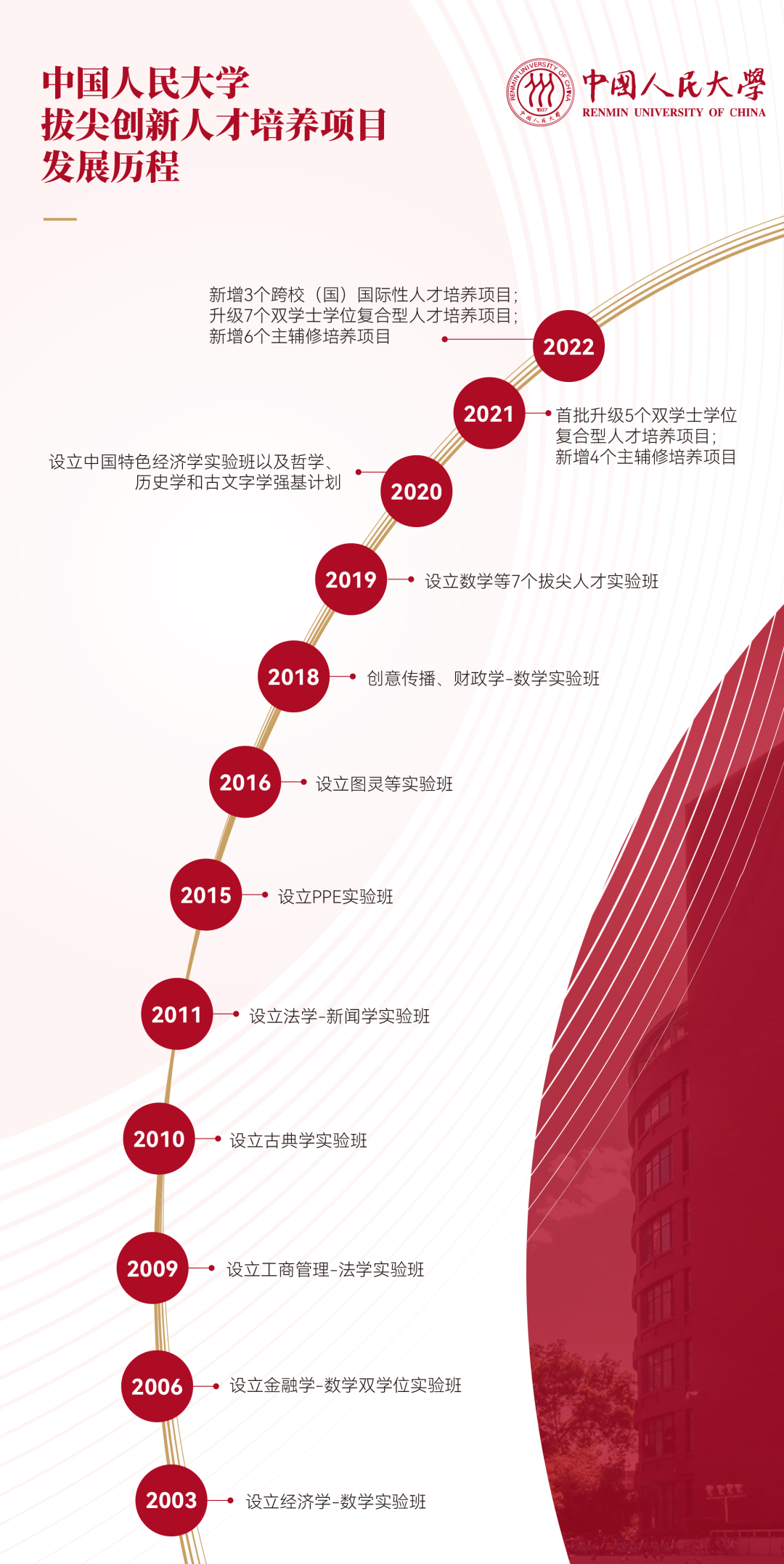 新世纪以来,学校面向国家重大战略需求,创新长周期培养、全要素重构、多环节联动的培养模式,持续推动拔尖创新人才培养项目建设。2003年,学校设立首个拔尖创新人才培养项目——经济学-数学实验班,此后陆续设立金融学-数学实验班、法学-新闻学实验班、PPE实验班、图灵实验班、创意传播实验班以及财政学-数学实验班等项目。2019年以来,项目建设进入快速发展阶段,当年设立数学等7个拔尖人才实验班。2020年,设立中国特色经济学实验班以及哲学、历史学和古文字学强基计划。2021年首批升级5个双学士学位复合型人才培养项目。2022年再次升级7个双学士学位复合型人才培养项目,新增“国际新闻与传播-西班牙语”联合学士学位项目等3个跨校(国)国际性人才培养项目。