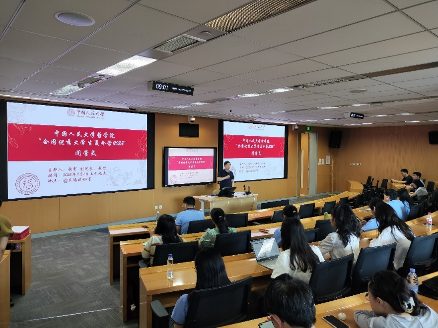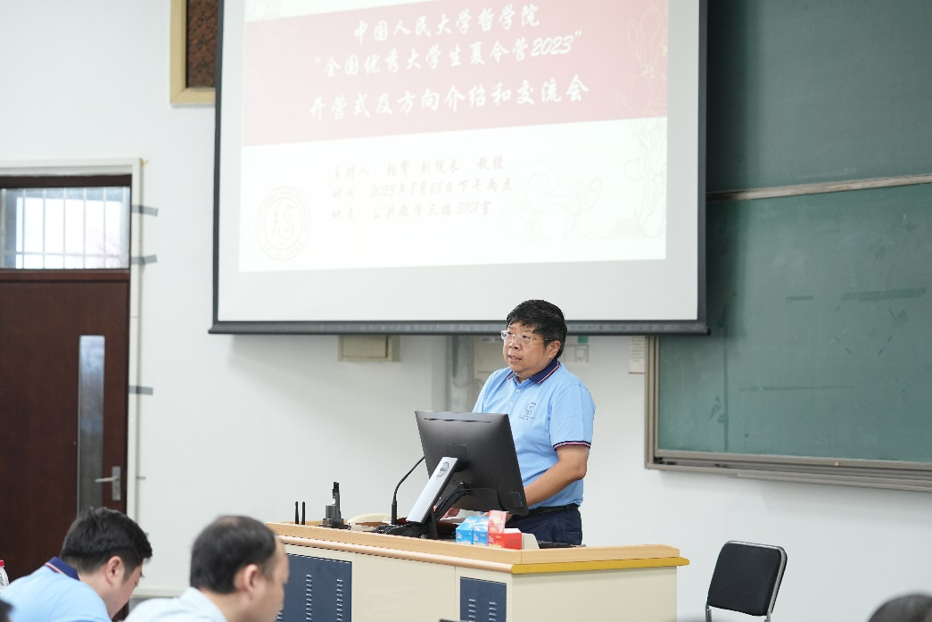 在开营式上,臧峰宇院长诚挚欢迎各位同学并做了精彩致辞。他指出,哲学研究需要开阔的视野和广博的学识,需要走出给“我思”设定的各种“洞穴”。今天我们比以往任何一个时代都更需要哲学;比以往任何一个时代都需要哲学与其它学科交叉融合。始终面向时代问题,把握时代脉搏,与时代同呼吸,为时代精神立言,一直是人大哲学学者追求的治学境界。臧峰宇院长希望各位营员在夏令营中了解人大哲学学科的传统,希望大家既具有哲学研究的国际视野,也具有思考问题的本土情怀,在今后的研究中关注时代的问题。他表示,哲学总是以青春的激情走向远方,祝同学们在夏令营期间有更多更好的收获。