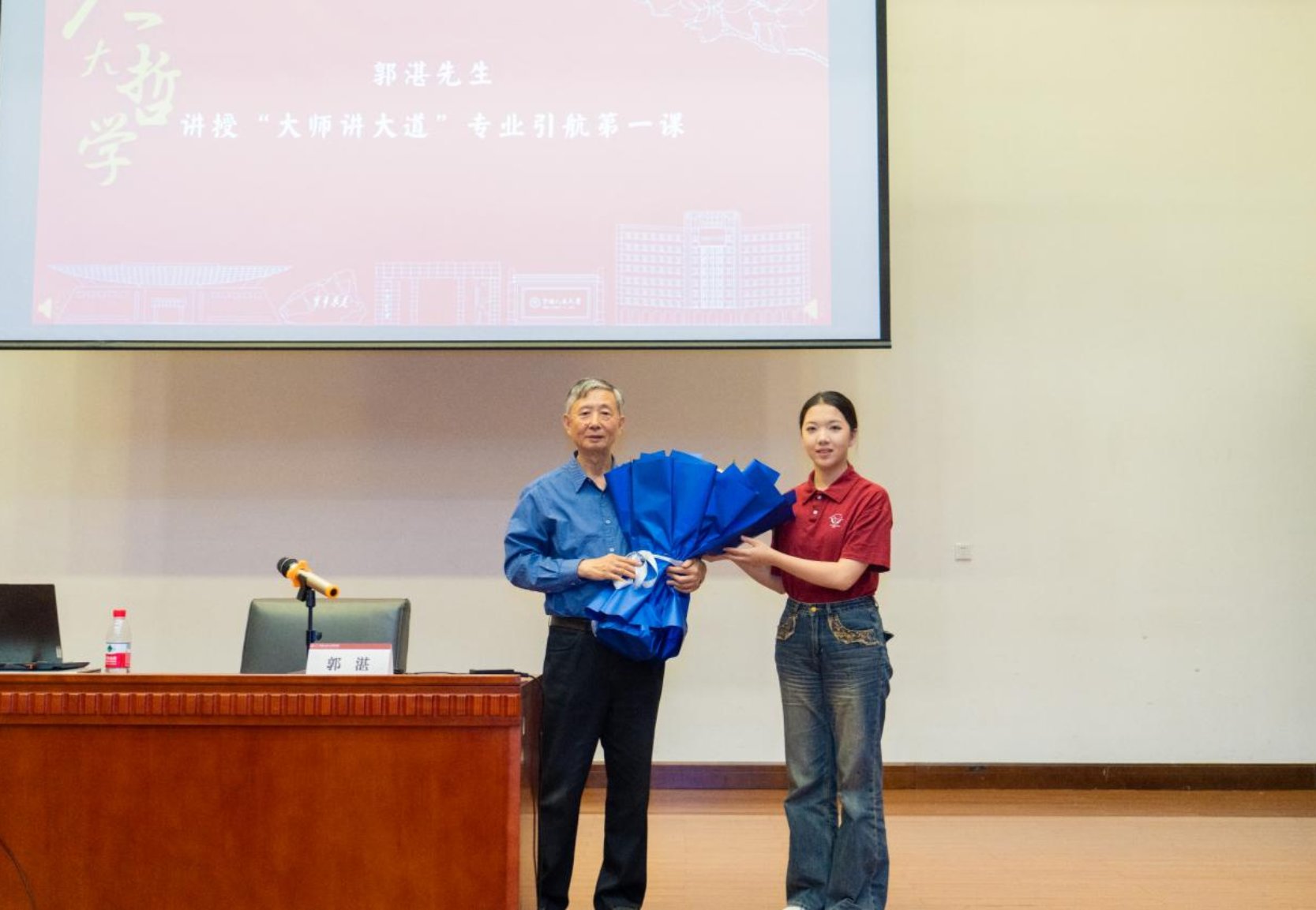 在讲座互动环节,臧峰宇院长向大家介绍了自拍流出 2024级PPE专业本科生。在本次军训中,他们所在的一连是唯一获得“陕公连”荣誉称号的连队。希望“人大哲学人”能够传承红色基因,庚续红色血脉,以奋斗姿态做复兴栋梁、强国先锋。最后,学生代表向郭湛教授献花,在场全体师生祝愿郭湛教授身体健康、学术之树常青。